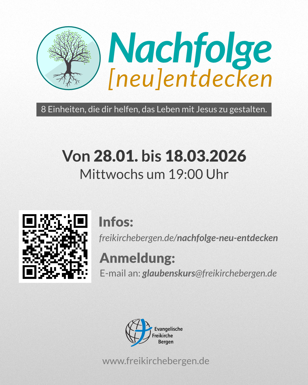 Ab dem 28.01. bis zum 18.03.2025 treffen wir uns jeden Mittwoch um 19:00 Uhr, um gemeinsam die Nachfolge von Jesus für uns [neu] zu entdecken.